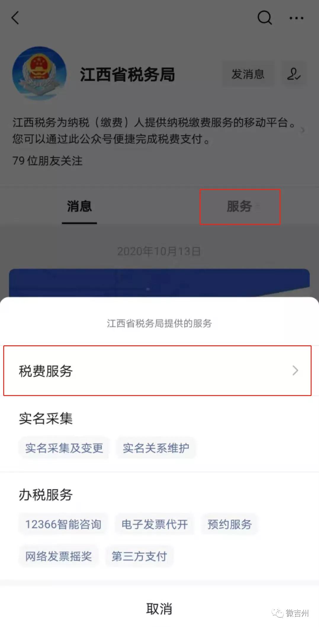 02、进入江西省税务局公众号,点击【服务】选择【税费服务】