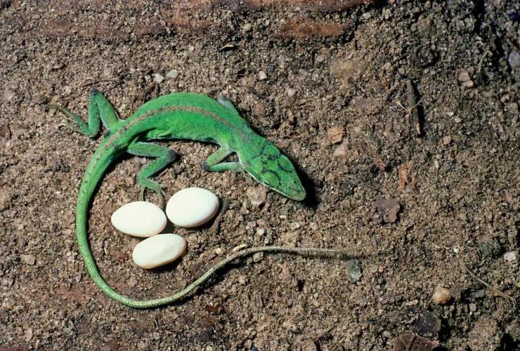 青蛙将卵产在水中并在水中受精,而蜥蜴将受精卵产在陆地上。蜥蜴的受精卵较大,卵内养料较多并含有一定的水分,卵外还有坚韧的卵壳保护,使卵能够在陆地环境中发育成幼蜥。因此,蜥蜴的生殖和发育可以摆脱对水环境的依赖,这也是蜥蜴能终生生活在陆地上的重要原因。