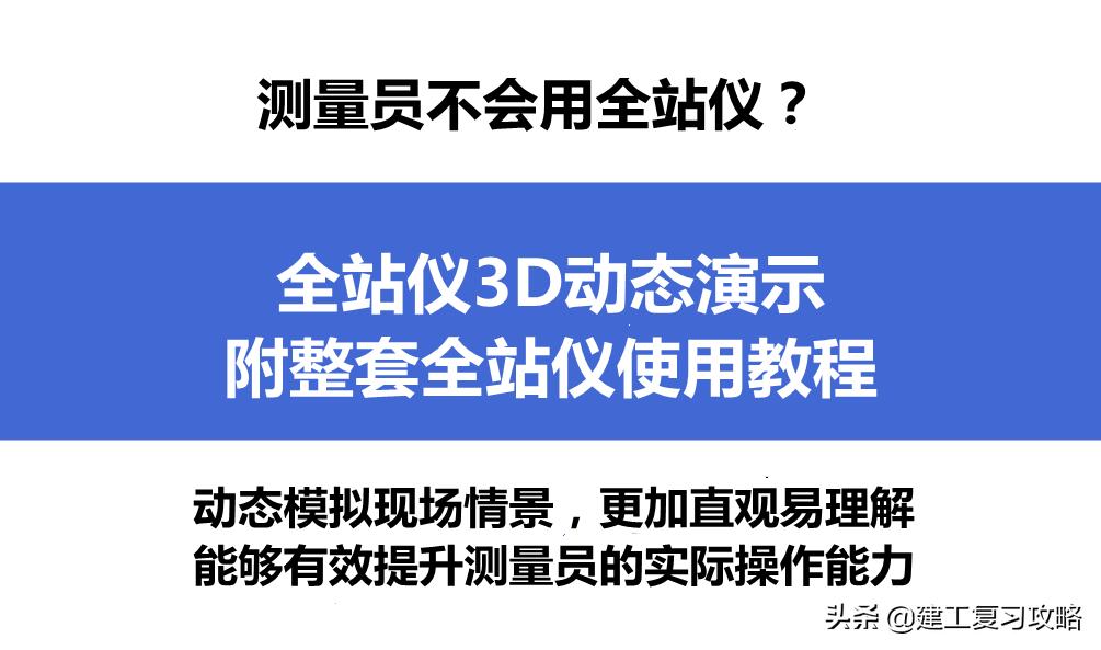 测量员不会用全站仪。全站仪3D动态演示+整套全站仪使用教程,动态模拟现场情景,更加直观易理解,能够有效提升测量员的实际操作能力,建议测量员收藏备用。