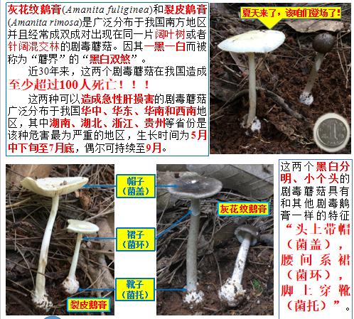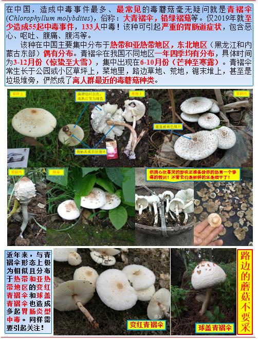 我国毒蘑菇约有100多种,引起人严重中毒的有10余种,分布广泛。我国每年都有毒蘑菇中毒事件发生,以春夏季最为多见,常致人死亡。