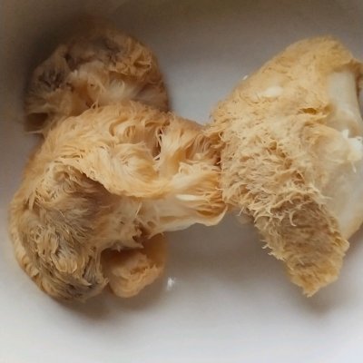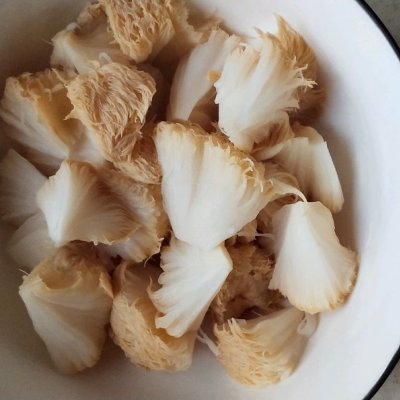 1、干猴头菇用水冲掉表面灰尘和杂质,用凉水泡2小时,刚开始时要拿个盘子或者碗 把猴头菇压着,要不然它会浮在水面上