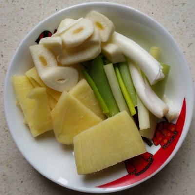 4、葱切段,姜蒜切片备用