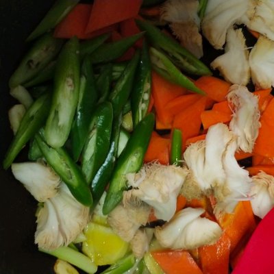 7、把食材放进去翻炒均匀放入调料调味加点热水焖2分钟,