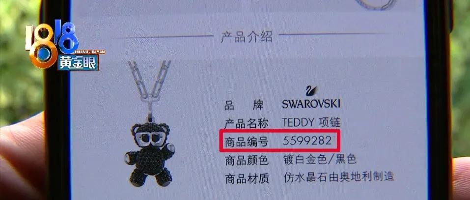 被退回来的包裹,小周还没有拆封,他当着记者的面打开了快递包装,里面是一条浅色项链,记者注意到,项链外包装上有个商品编号,是5599282,项链标签上的编号也是这个,施华洛世奇官方旗舰店上的商品详情显示,这个编号对应的是那款黑色项链,而这款浅色项链对应的编号,应该是5452026。