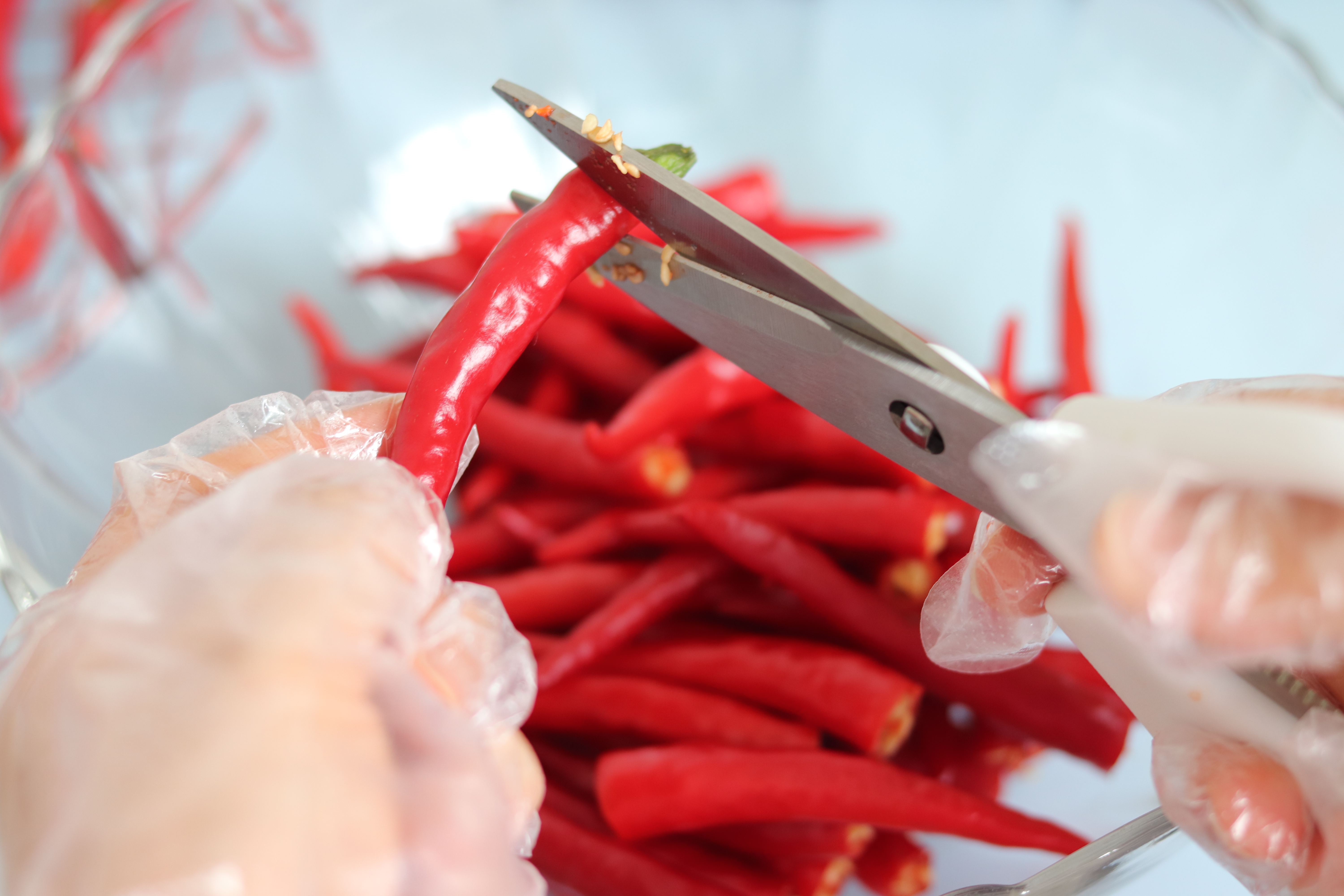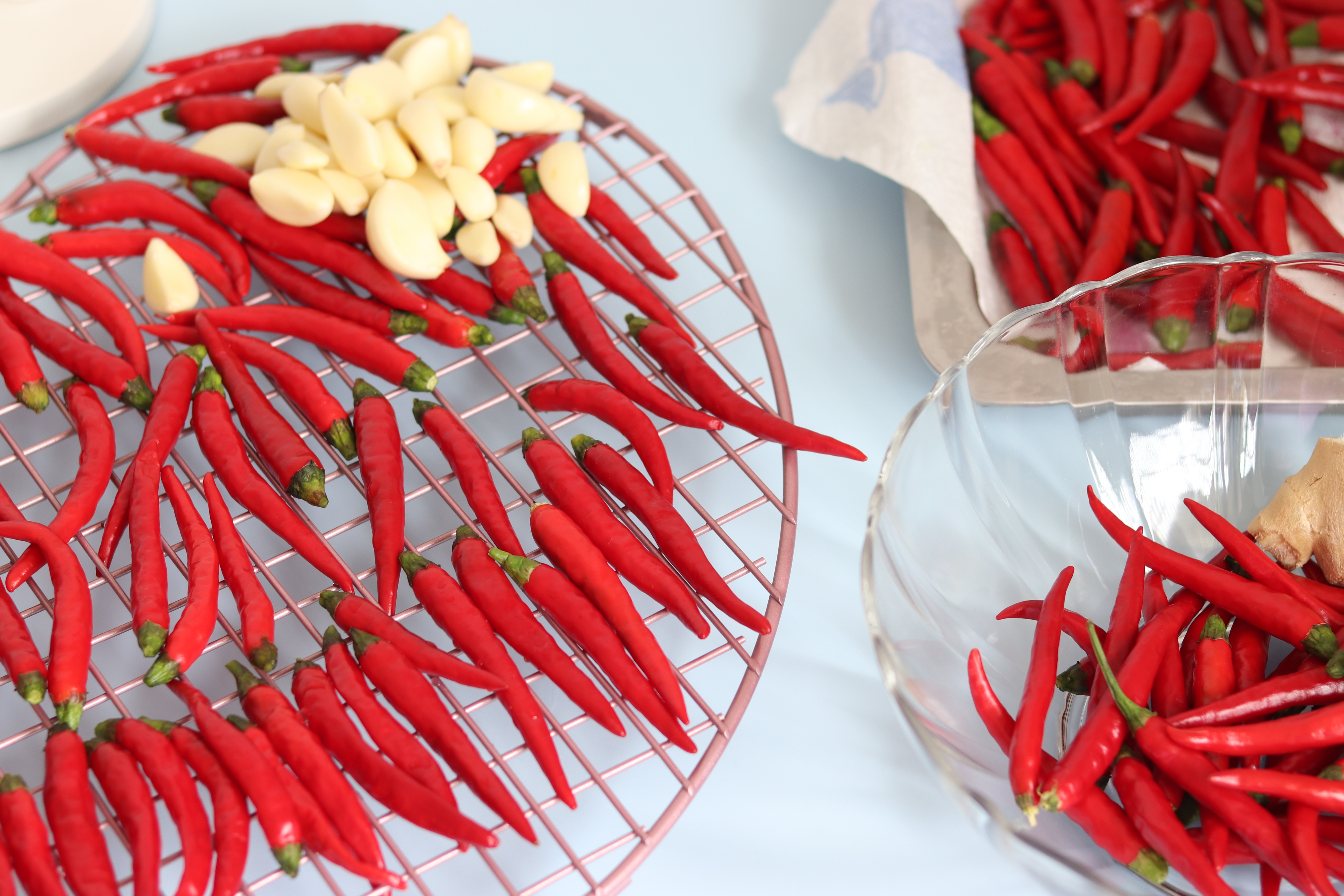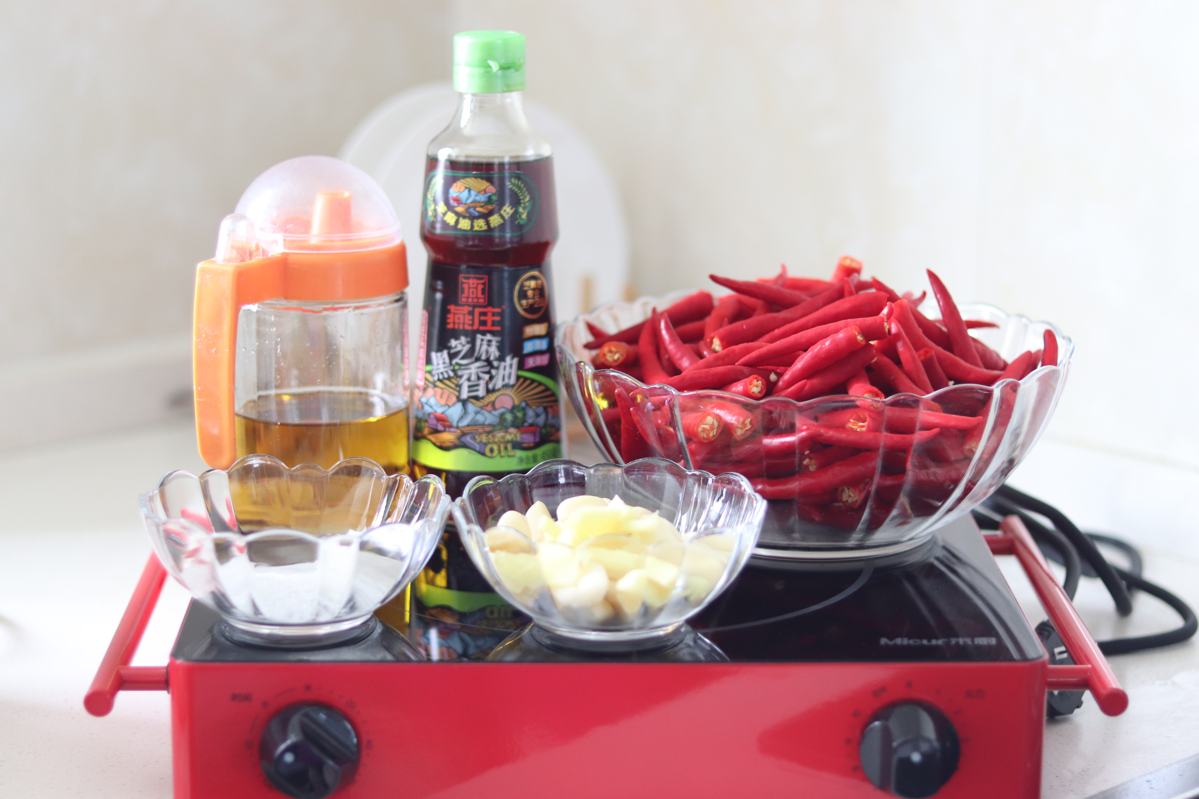【所需食材】:辣椒适量,蒜适量,生姜适量,菜籽油适量,盐适量,白糖适量,香油两勺,