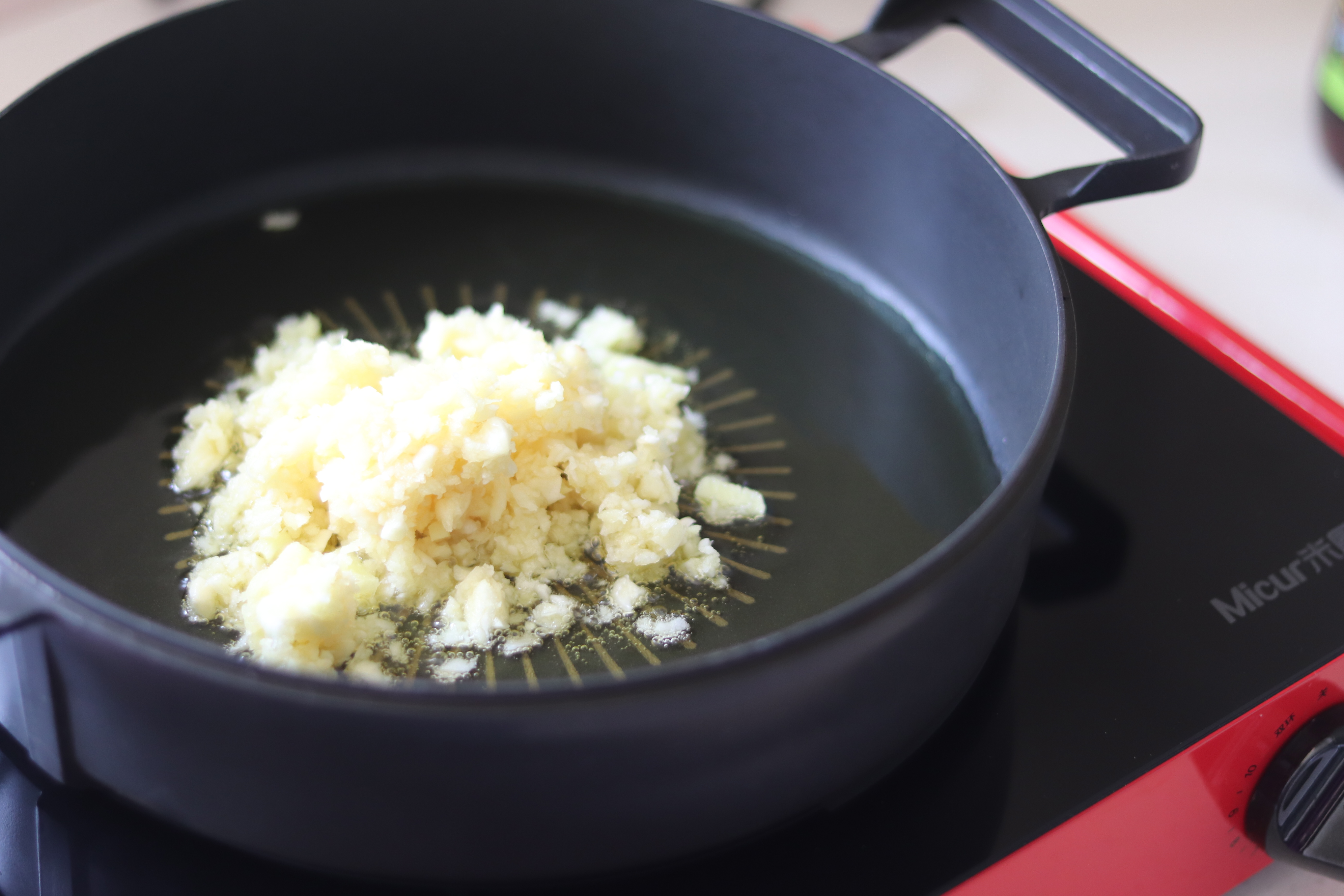 7、锅中准备适量的油,油温四成热的时候加入准备好的姜蒜末下锅,炸出香味,这时候保持火候不要太大,只要炒出姜蒜的香味就可以了,千万不要温度太高炒糊。