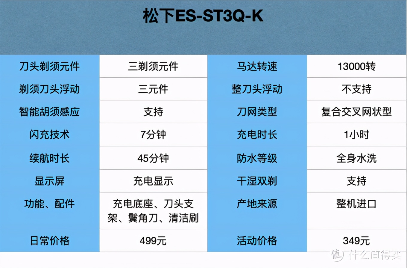 松下ES-ST3Q-K配置有智能胡须感应,这项功能非常实用,能够根据剃须部位胡须密度做出适当的动力调节,并且搭配的都是13000转/分钟的高速磁悬浮马达,剃须很高效,加上松下专利30°拱形刀头,在400元内价位,更推荐松下ST3Q,属于平价中高配置。