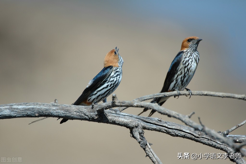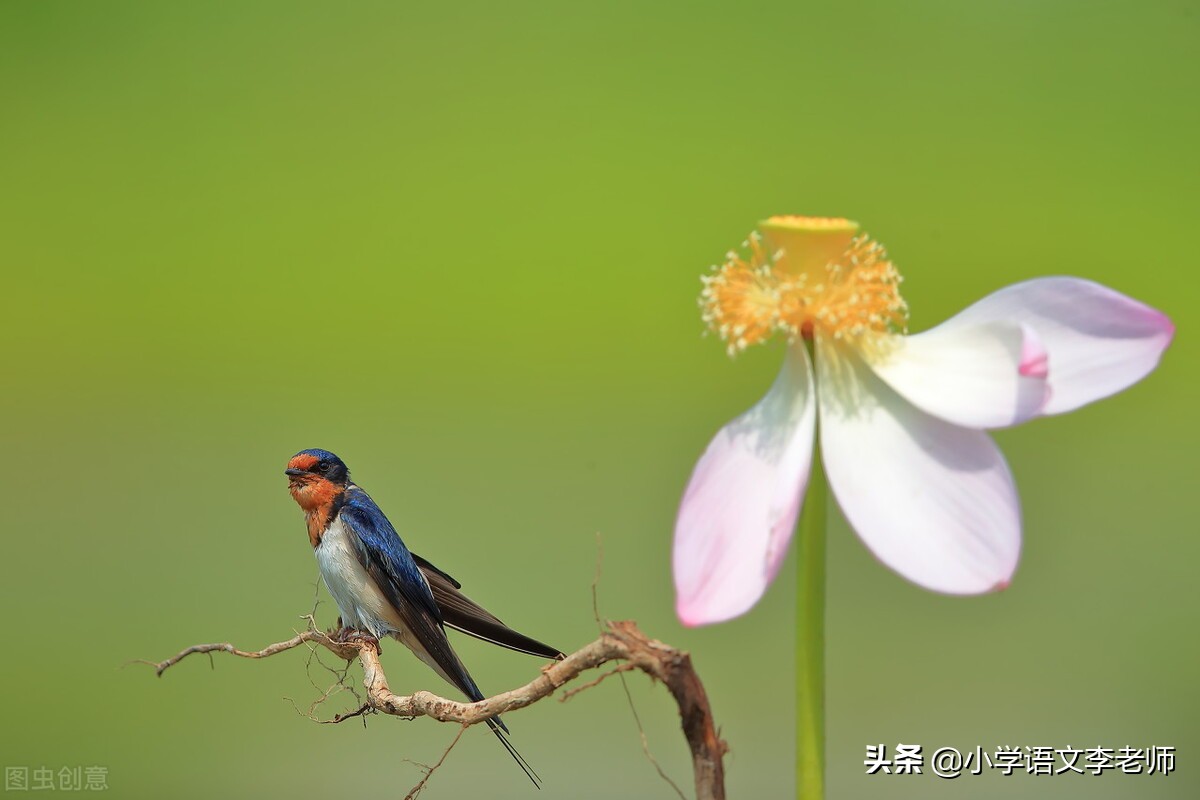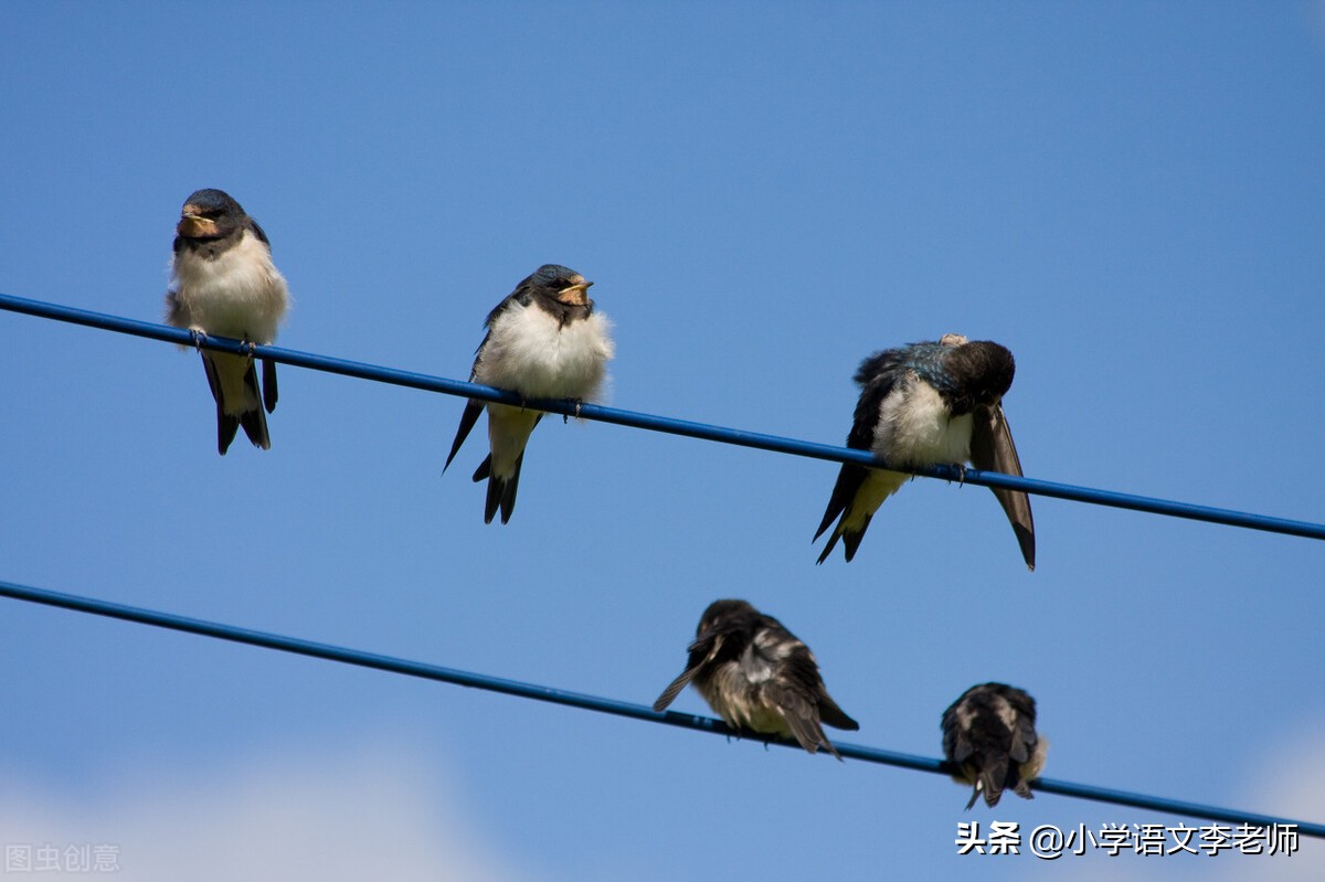 “嫩蓝的春天,几支木杆,几痕细线”构成了旷远的背景,“几个小黑点”则是这幅画的主角,描绘了一幅恬静、悠闲的画面。“多么有趣的一幅图画呀!”表达了作者赞美春天、喜爱小燕子的情感。