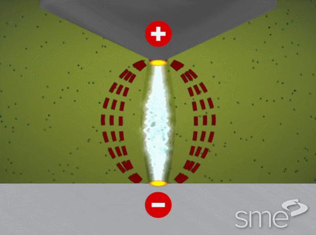 当两电极间加上脉冲电压后,当工件和电极间保持适当的间隙时,就会把工件与工具电极之间的工作液介质击穿,形成放电通道。
