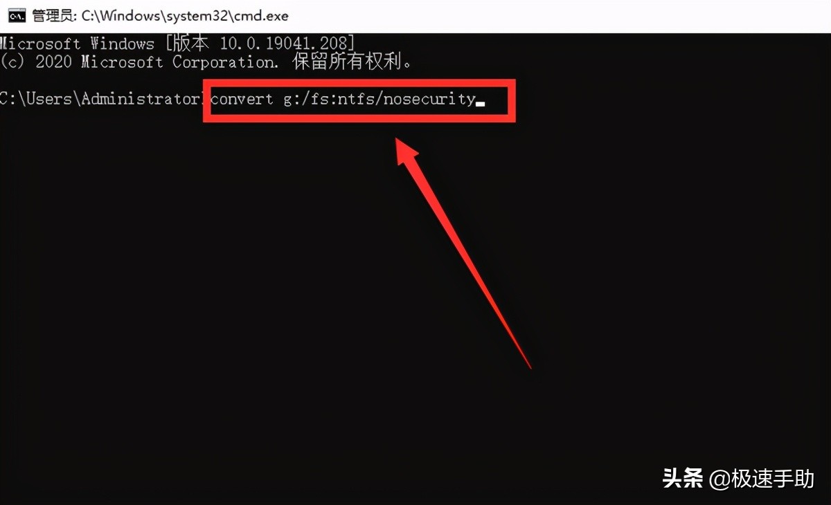 ??第三步,在【命令提示符】中输入【convert?g:/fs:ntfs/nosecurity】指令,然后按【回车】键确定即可。?