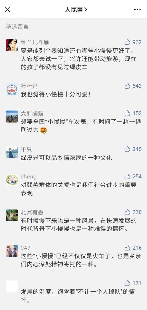 4月20日,人民网官方微信发布《人民日报点赞“小慢慢”!》一文后,引发了一大波“回忆杀”。除了感动于“不让一个人掉队”的民生温度之外,网友们也纷纷回忆起了自己乘坐“慢火车”的经历。还有不少网友表示想要全国“小慢慢”车次表。