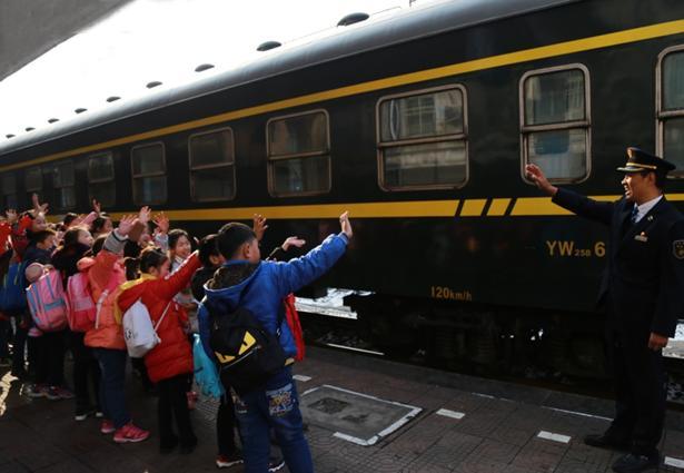 列车到站后孩子们和列车长分手道别。张雁南 摄