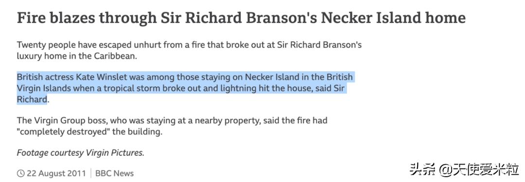起火时凯特不但救出自己的女儿儿子,还帮着Richard Branson救出了他的90岁妈妈,让这位老浪子感动不已,事后也在多个场合公开感谢凯特。