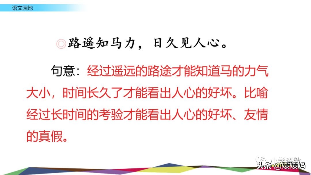 句意:经过遥远的路途才能知道马的力气大小,时间长久了才能看出人心的好坏。比喻经过长时间的考验才能看出人心的好坏、友情的真假。