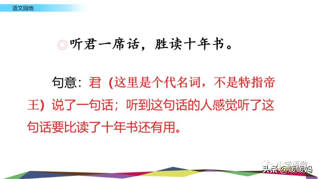 句意:君(这里是个代名词,不是特指帝王)说了一句话;听到这句话的人感觉听了这句话要比读了十年书还有用。