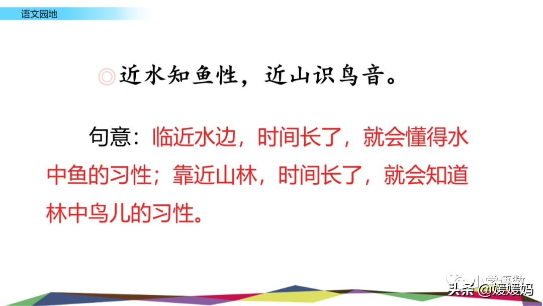 句意:临近水边,时间长了,就会懂得水中鱼的习性;靠近山林,时间长了,就会知道林中鸟儿的习性。