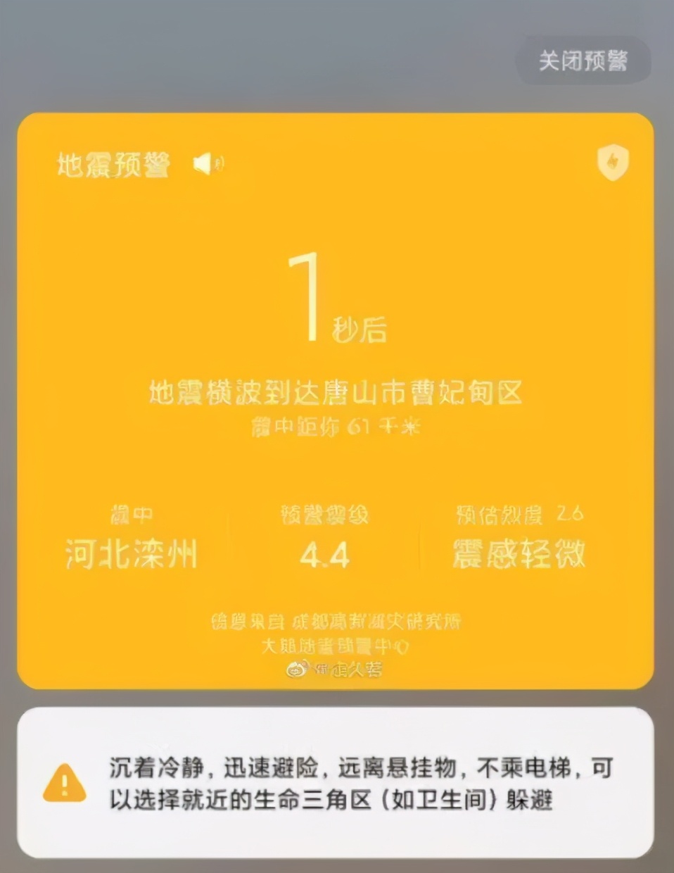 本次唐山4.3级地震发生的时候,就成功预警到了此次地震,给唐山市提前10秒预警,给天津市提前39秒预警,所以地震预警越来越强了,未来可能预警的时间会更加长,我们拭目以待吧。同时再次强调,唐山的朋友不用担心大地震的可能性了,本次地震就是属于正常的现象,不是新地震情况的出现。