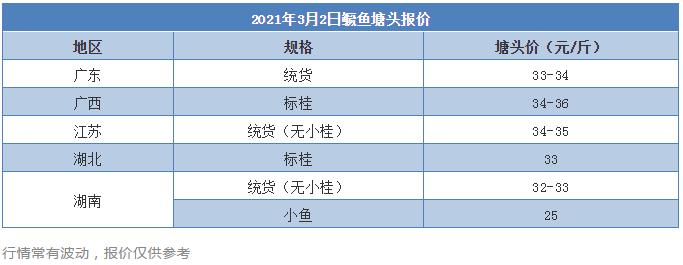 江苏:统货(无小鱼)报34-35元/斤,同比上周上涨2-3元/斤。当地存塘鱼已经很少,目前大多数养殖户正在为新一年的养殖做准备。