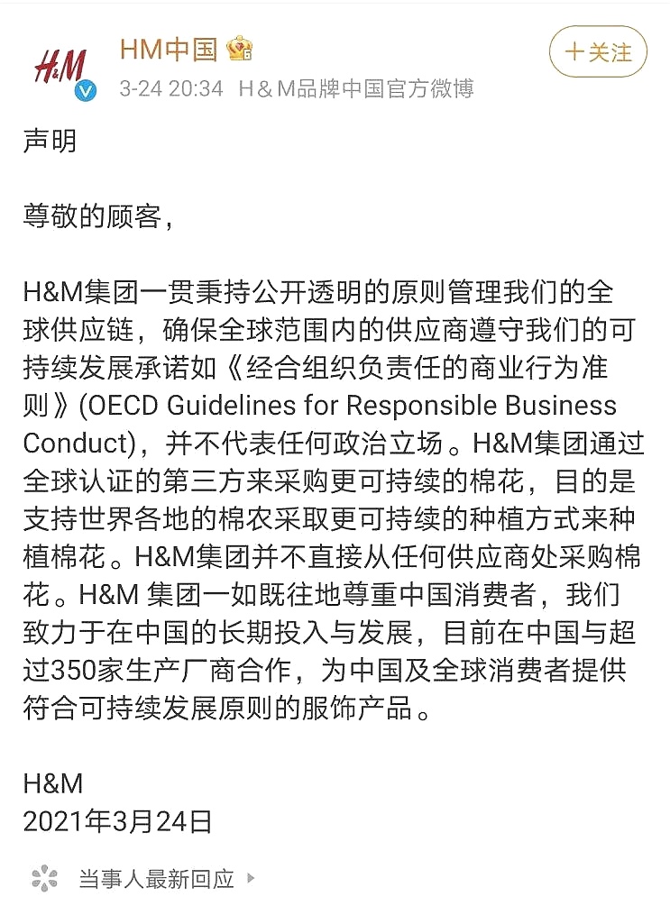 然而,就是这样一家看似不温不火的企业,却第一个站出来“搞事情”,这种行为可以说是不自量力,难道中国市场不想要了吗?在遭到中国消费者的抵制后,H&M公司紧跟着发布了一个声明,然而这一声明直接暴露了自己:傲慢。