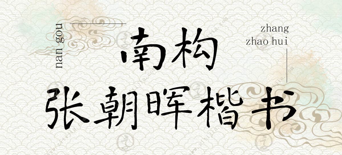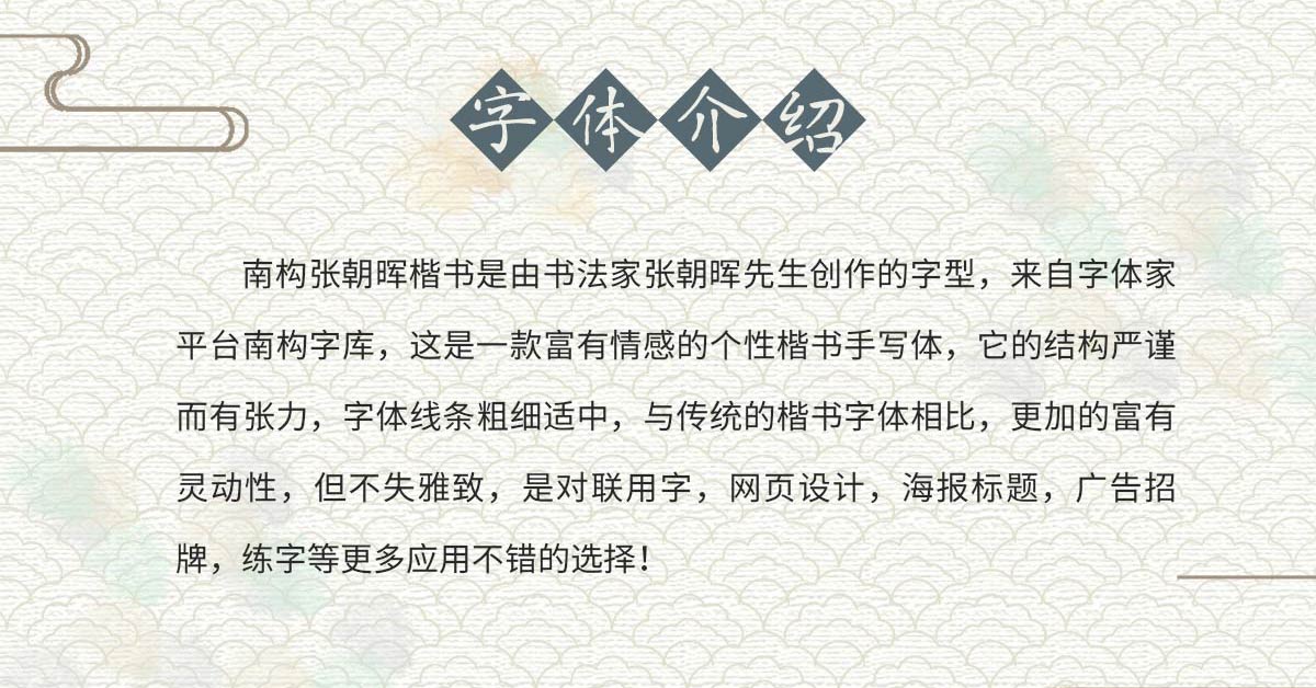 张朝晖老师的书法作品追求“圆融、简净、旷达、自然”之风,书法作品被多家艺术机构所收藏,书艺极精。南构张朝晖楷书字体,在风格上有独到之处,是积几十年书法经验创作的独具温度的书法字体,由字体家平台南构字库独家制作发行。首先,这款笔画分明充满力量,结构严谨而有张力,在提顿、藏露、方圆、快慢等用笔方法上都做到圆融,使得字体在工整端庄中富有温度。其次,字体工整规范,简净而不带潦草、粘连,使得字体视觉效果极好。第三,字体重笔之处饱满而酣畅,轻笔之处娟秀而清淡,运笔轻快流畅,具有较好的力量和自然的节奏,方劲有力,微小之处流露出大气磅礴。但这款字体加工较为粗糙,很多细节不太流畅,需要在后期精进,以期达到自然、旷达之意韵。
