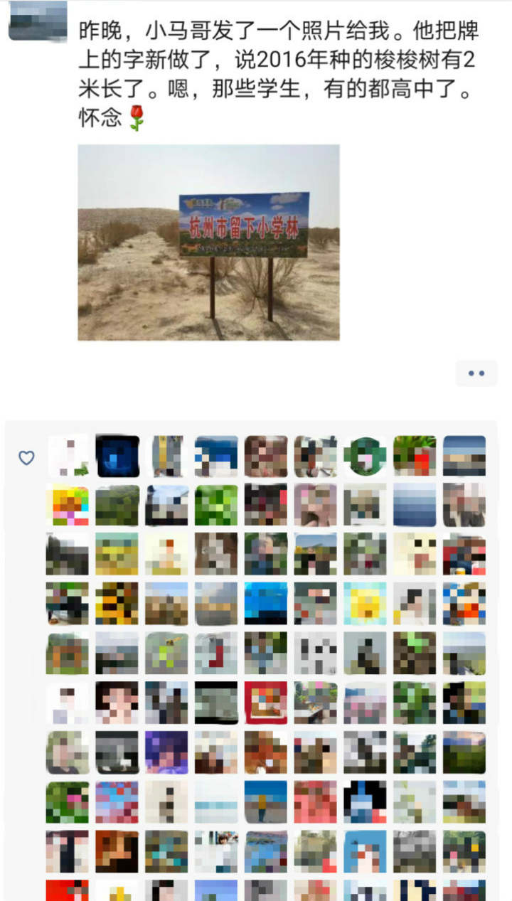 最近,杭州留下小学校长孔庆根在朋友圈发了一张图:黄土地上,“杭州市留下小学林”几个字,在梭梭树的映衬下,显得特别亮,“小马哥发了一个照片给我,他把牌子上的字新做了,说2016年种的梭梭树有2米长了。”