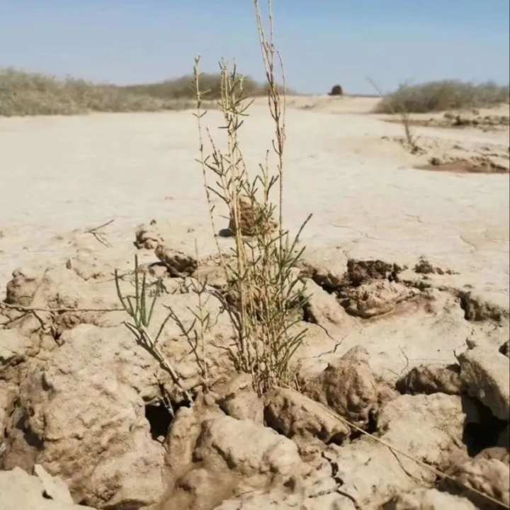 跟着马老师的脚步,孩子们沿着一条绵延12公里的道路前行,视野所及,是35000多亩的梭梭树种植基地。我们看到,在荒芜的沙丘和盐碱地上,虽没有江南的红情绿意,但丛丛梭梭正用那细而有力的枝条彰显着春的生机。马老师告诉同学们,曾经,这里也有湖泊,叫昌宁湖,但是由于人为活动和气候变化,绿洲逐渐演化成了今天的沙漠。为了防止荒漠化的面积越来越大,梭梭树便承担起了守卫沙漠瀚海边缘民勤的使命。如今,梭梭树与杨树、红柳、白刺等植物一起筑起了防风固沙的三道屏障,阻挡住了沙化的脚步,河西走廊的生命之路才得以绵延千里。