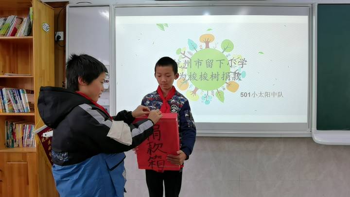 学校向少先队员们发起大型社会公益行动 —“绿色传递 爱撒民勤”活动的倡议,为民勤梭梭树捐款,10元就可以种一棵。同学们纷纷拿出压岁钱、稿费,在民勤种下爱心。杭州市留下小学继续书写与梭梭树的六年之约,筹集善款2万6千余元,为下一个春天的开篇,种下树的铺垫。