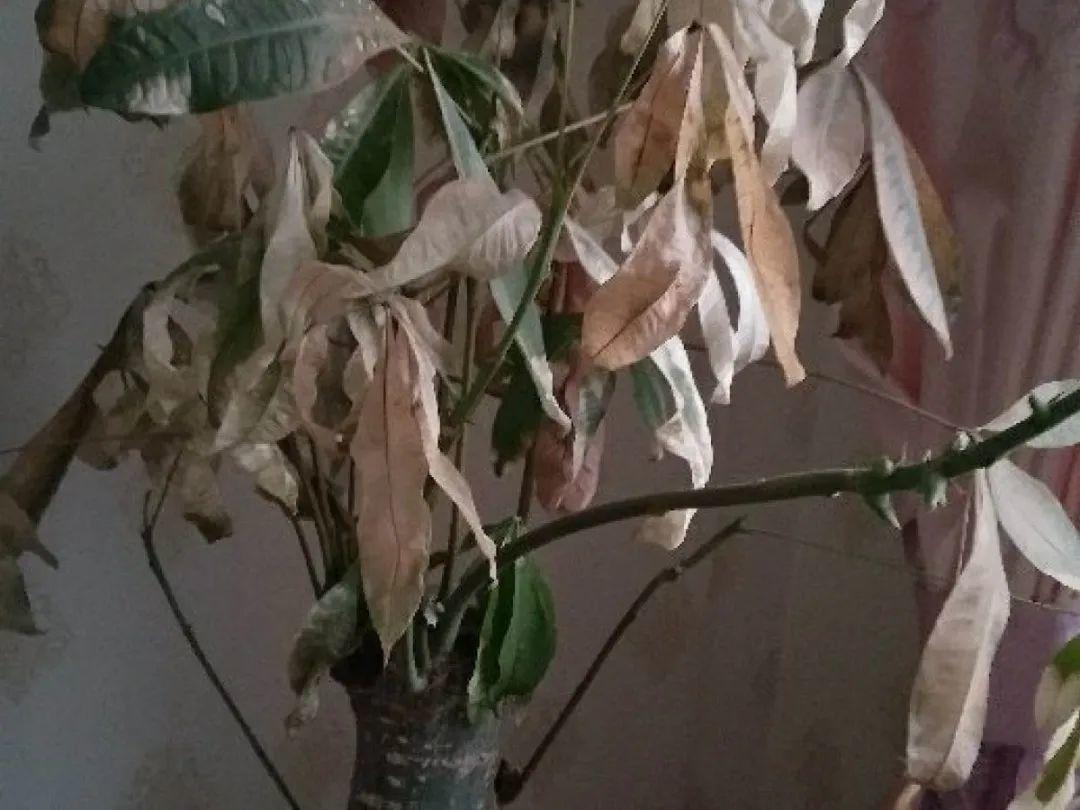 发财树缺水,也是另一个极端,长期不浇水,叶子耷拉干枯,如果同时暴晒,那很快就枯萎了,叶子是干燥的,而不是湿润的。