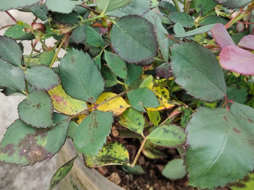 持续阴雨天、不通风、浇水过多,盆里一直湿漉漉的,月季叶子容易暗淡、变黄、长斑、颜色不均匀。