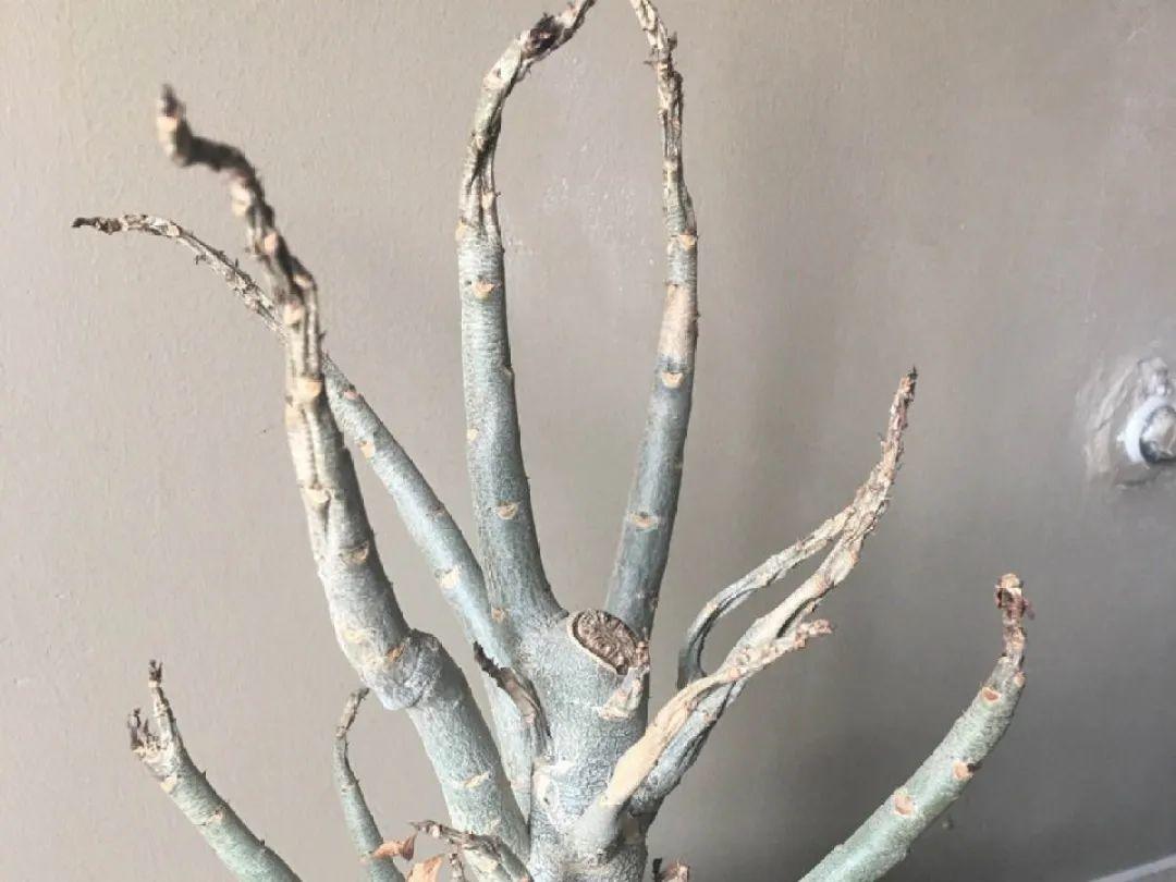 沙漠玫瑰虽然耐旱,但生长期还是要浇水的,缺水叶子会迅速干枯变黄,脱落,杆茎也会变软、皱巴巴的。
