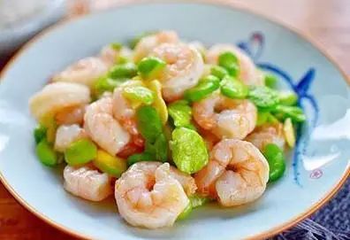 4.锅内放入少许油,倒入蚕豆翻炒片刻,下入虾仁,翻炒几下后加入先前调好的水淀粉, 大火收汁即可。