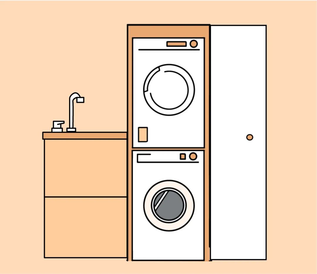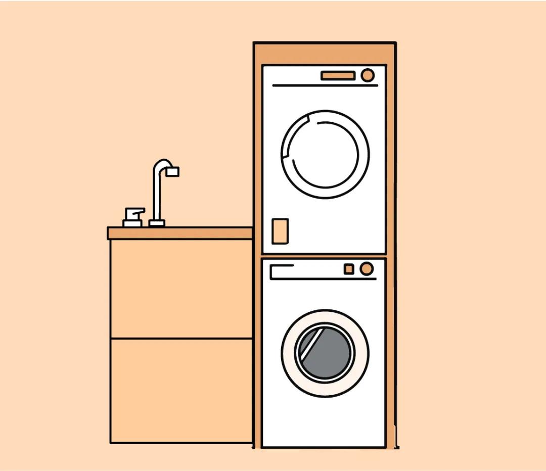 洗衣机和烘干机叠放是最不占空间的一种放法了,如果是同系列的洗烘,可以这样直接叠放上去,利用配套的挂钩就可以固定住,高度大概在1800mm左右,但别忘了也要在顶部预留十公分的距离哦~