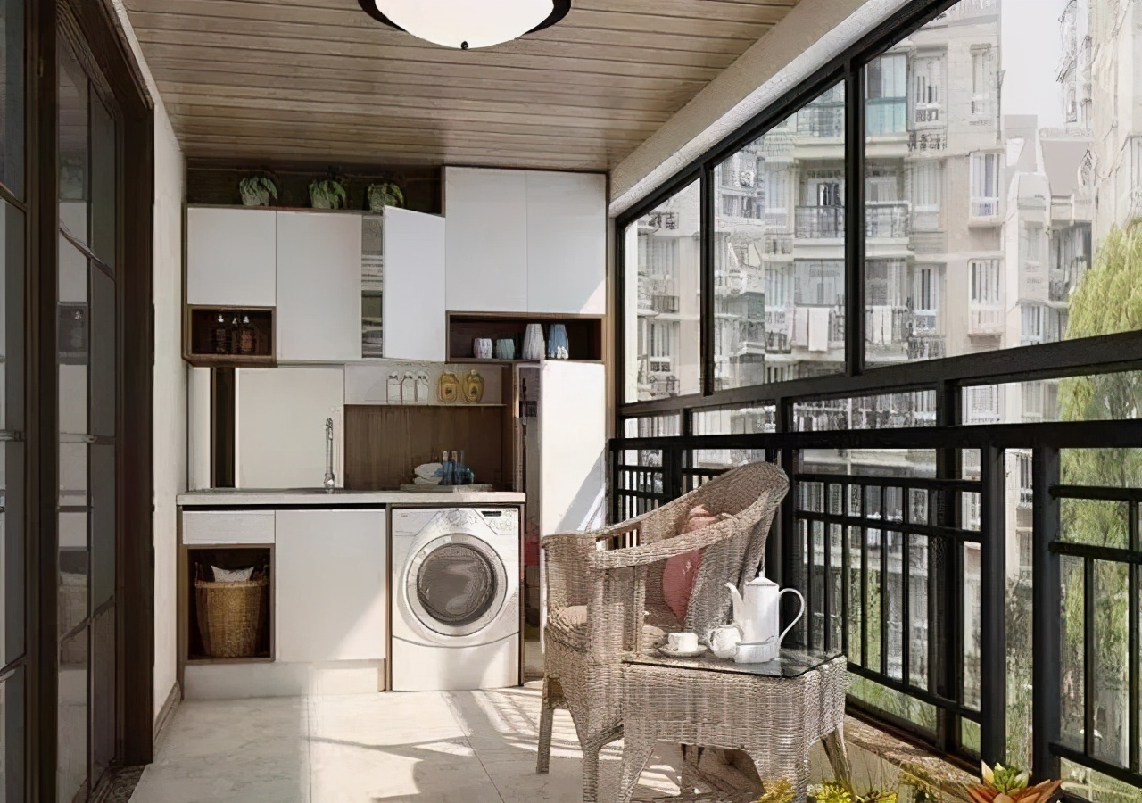 一般阳台在这个宽度的都可以这样打造,可以最大化利用面积,旁边的储物收纳柜可以放一些家务工具,像是吸尘器,扫把,拖把之类的。