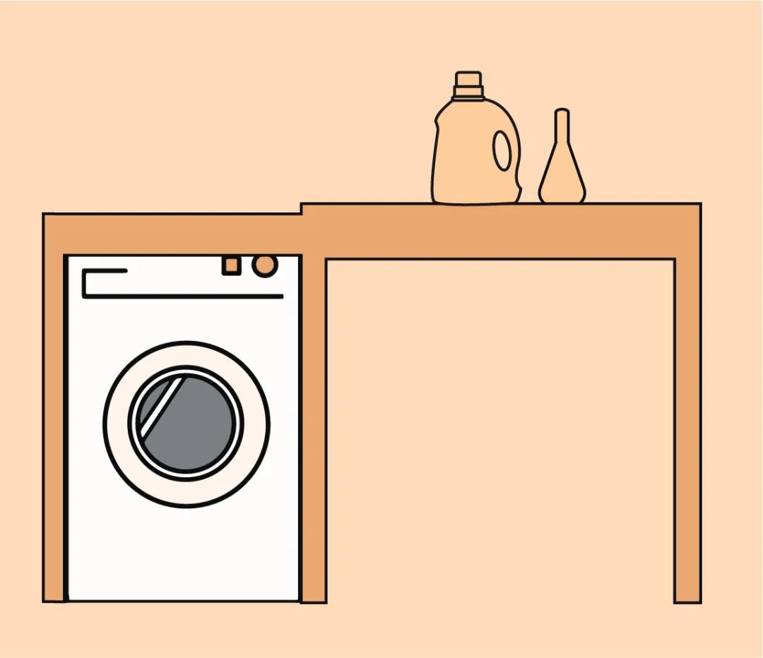如果没有洗手台的需求,又只有一个单体洗衣机或者洗烘一体机,可以在洗衣机上可以打造一个一体式的台面,注意,必须要滚筒式的洗衣机哦!翻盖的洗衣机上是没办法做台面的。平时在这里叠衣服、放东西都是非常方便的。