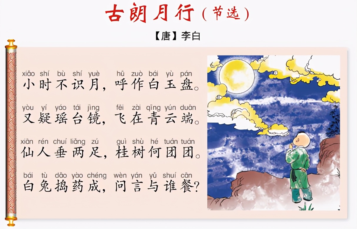 ①李白 (701~762):字太白,号青莲居士,又号 “谪仙人 ”,为唐代伟大的浪漫主义诗人,被称为 “诗仙 ”,与杜甫并称为 “李杜 ”。李白的诗歌豪放新奇,想象力非常丰富,而且他善于从民歌、神话中汲取营养和素材,著有《李太白全集》。 ②古朗月行: “朗月行 ”为乐府 “杂曲歌辞 ”中的曲名,李白在这里借用古曲的题目,所以前面加一 “古 ”字。③呼:称作。 ④白玉盘:白玉做成的盘子。 ⑤瑶台:传说中神仙的居所。 ⑥仙人:传说月中居住着仙人。也传说是驾月的车夫,叫舒望,又名纤阿。 ⑦桂树:传说月宫中有桂树。⑧团团:圆圆的样子。 ⑨白兔捣药:传说月宫中有白兔在桂树下捣药,又称 “玉兔捣药 ”。⑩餐:吃。