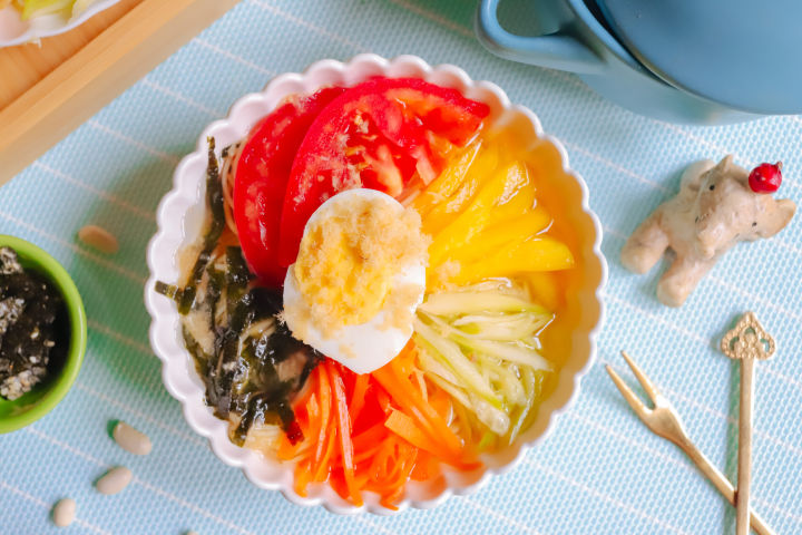 小米面条1袋、香油1克、海苔2片、熟鸡蛋1个、无添加酱油1克、白糖3克20克、胡萝卜20克、鳕鱼松5克、黄瓜、甜椒15克、柠檬25克、西红柿40克