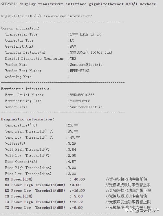 2、RX指的是接收光功率,TX指的是发射光功率,High Threshold指的是功率的最高值,Low Threshold指的是功率的最低值,一般光模块的说明书上会有光模块光功率的正常范围值,大家可通过对比光模块规格书上的参数来判断光模块的功率是否正常。