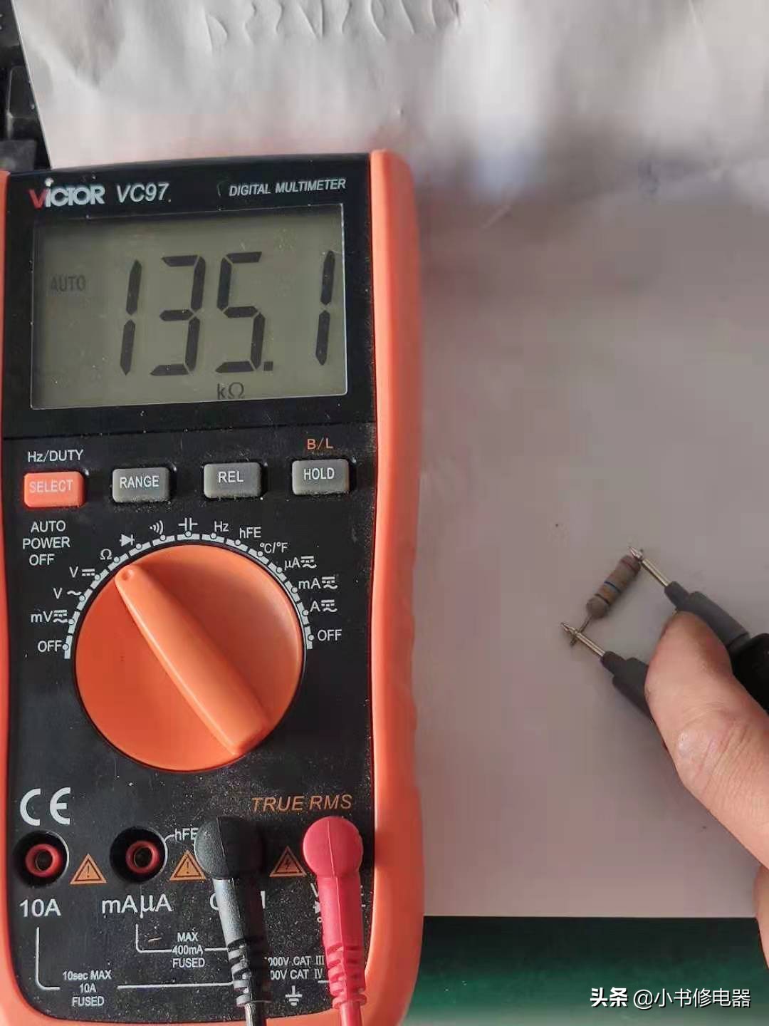 小书下面举例用一个135K的电阻来做示范,这是我从别的地方拆下来的,用上述方法看看测量结果是多少,分别用自动量程表和手动量程表测试,手动挡选择200K档请看下图:
