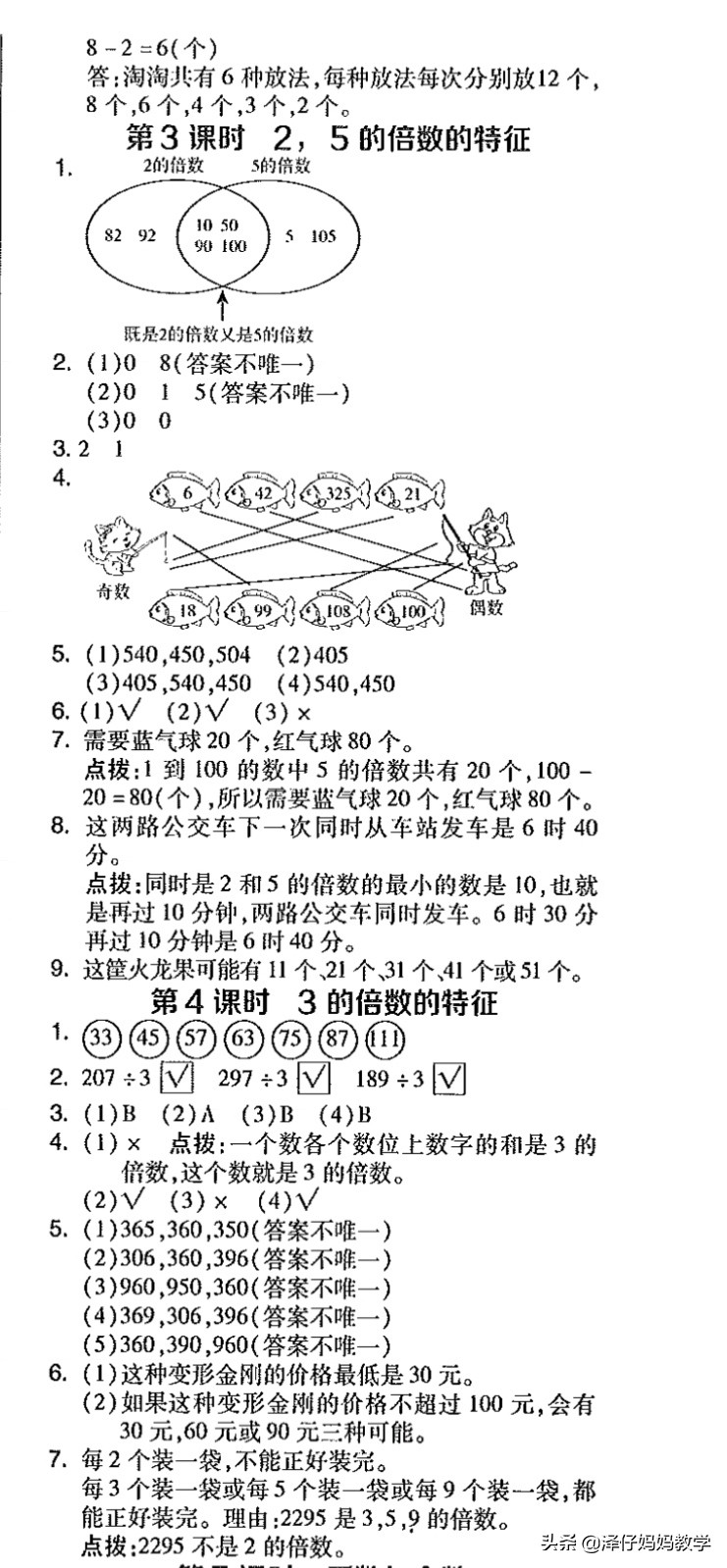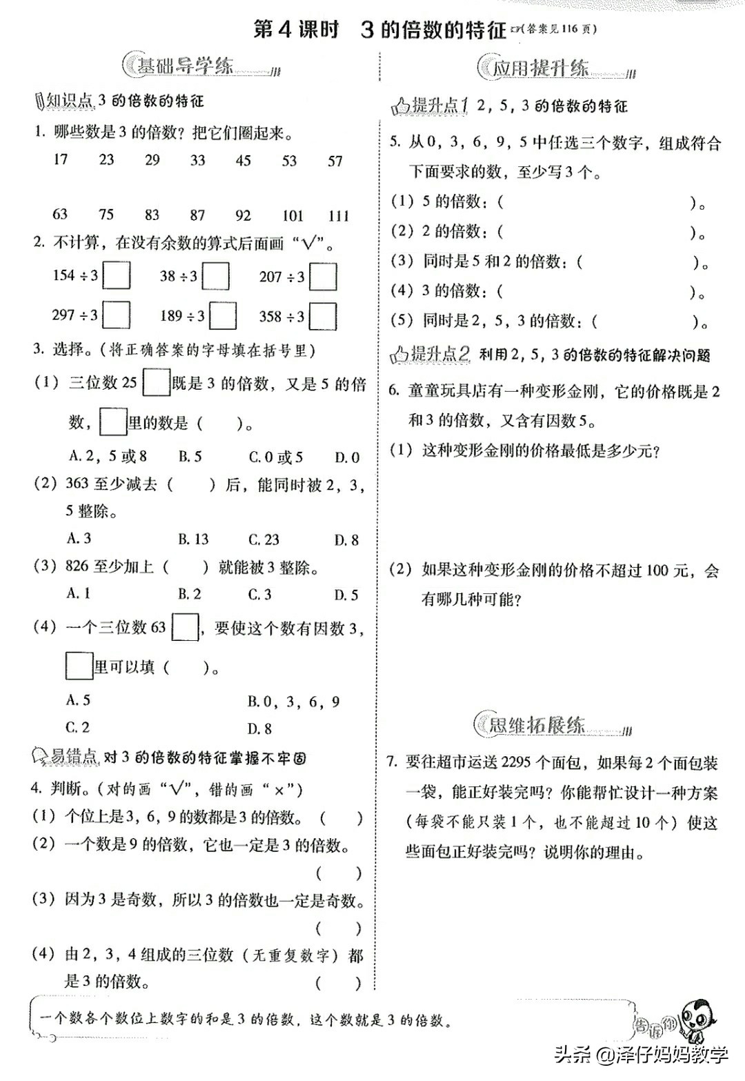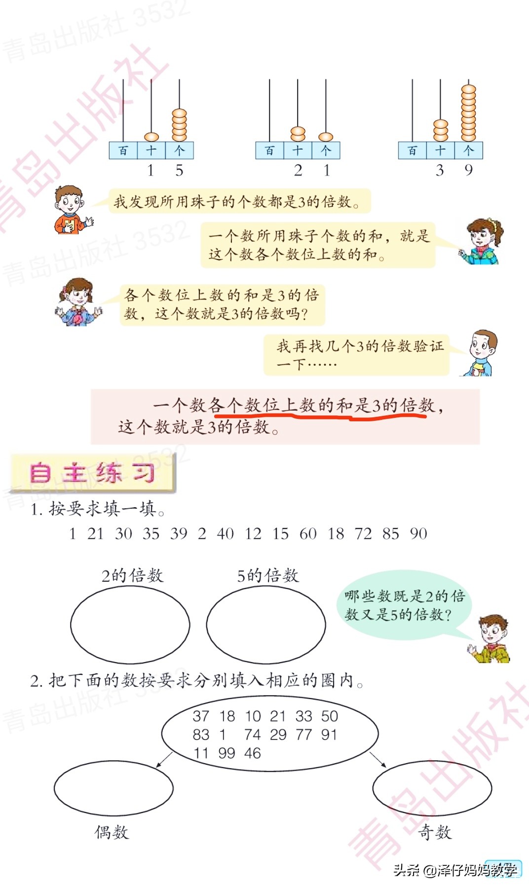 接下来学习3的倍数:3的倍数的特征:一个数各个数位上的数的和是3的倍数,这个数就是3的倍数。