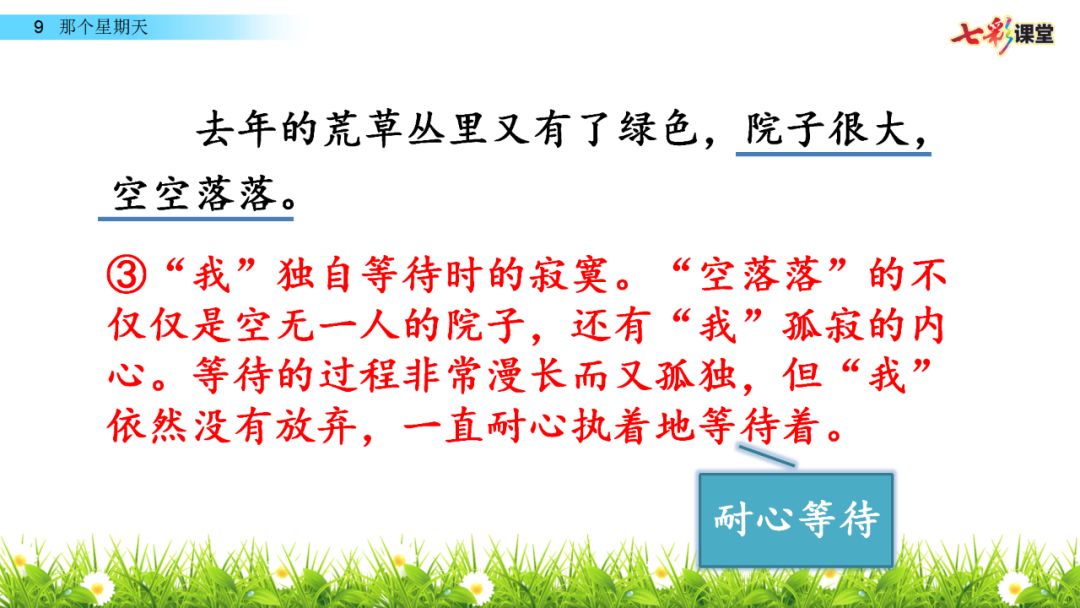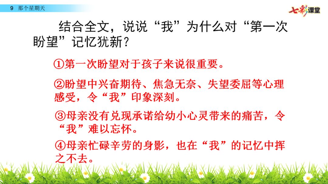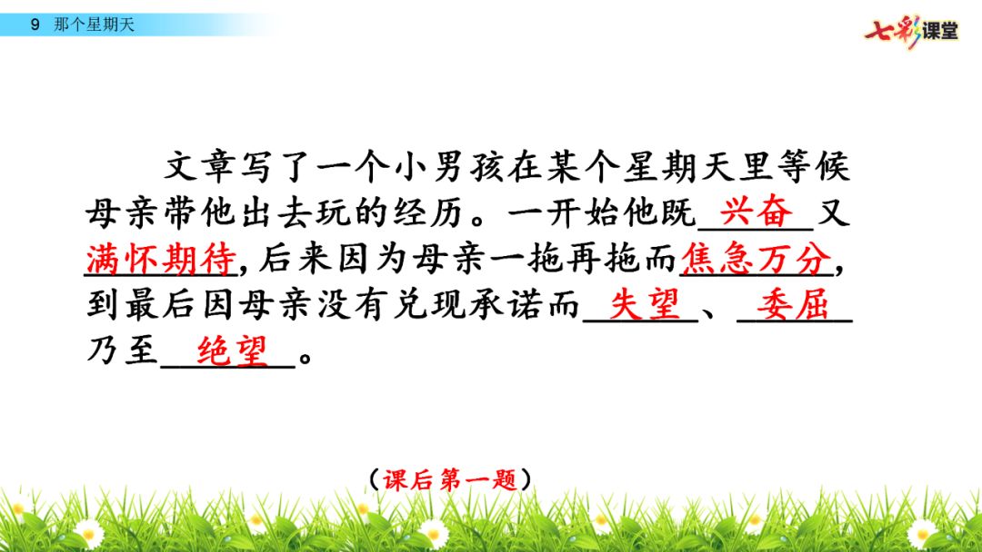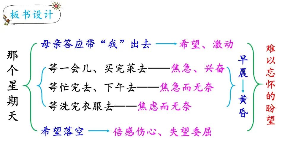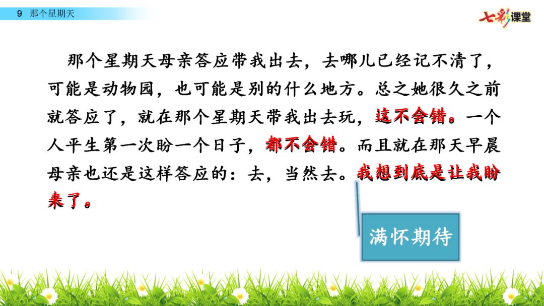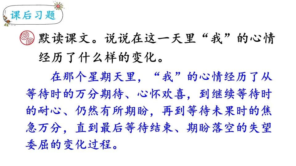 答:在那个星期天里,“我”经历了从等待开始时的万分期待、心怀欢喜,到继续等待时的耐心、仍然有所期盼,再到等待未果时的焦急万分,直到最后等待结束、期盼落空的过程。
