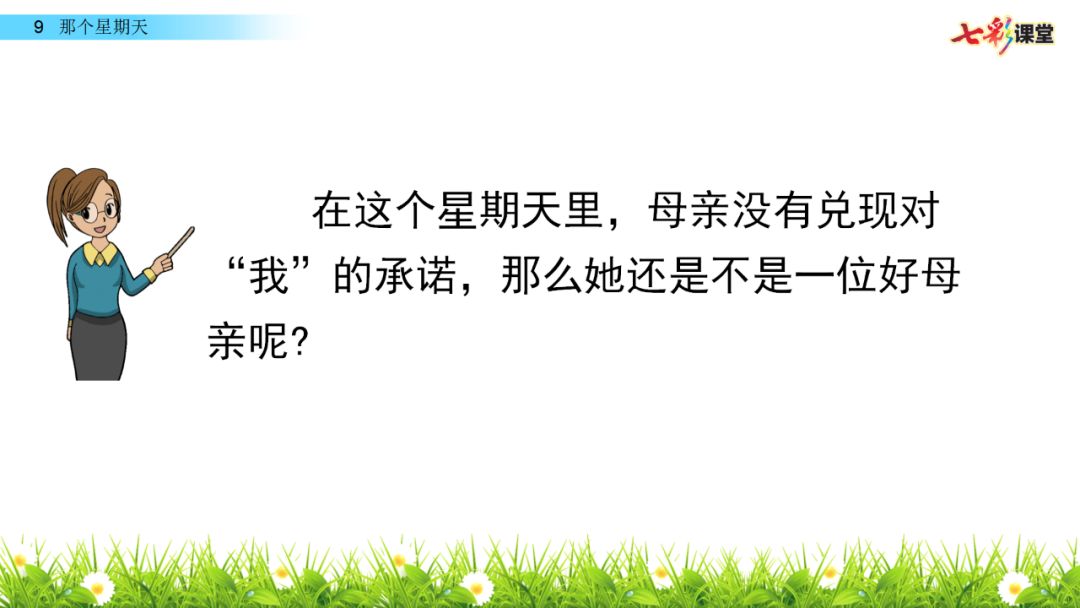 是一位真实而又矛盾的母亲。她为生活操劳,深爱自己的孩子,对于没法完成对孩子的承诺,满怀歉意,但是她也是容易忽略孩子感受的人,她一次次用话语敷衍孩子,最终没有遵守承诺,给孩子留下了心理伤害。