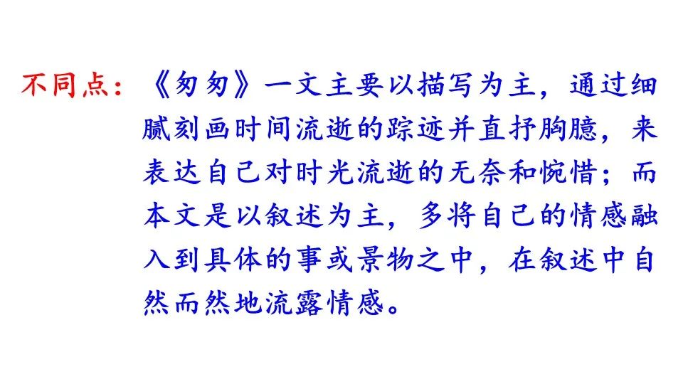 不同点:《匆匆》运用了拟人、比喻、夸张等修辞手法,用诗意的语言将抽象的事物表现出来,既表达了朱自清对时光流逝的无奈和惋惜之情,又能激发读者的共鸣。