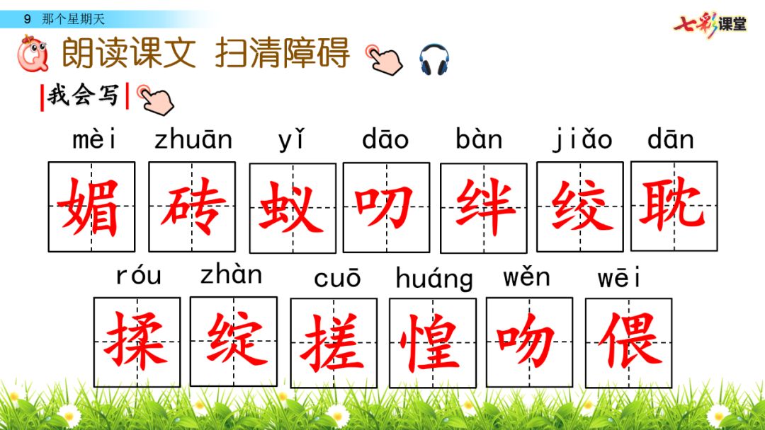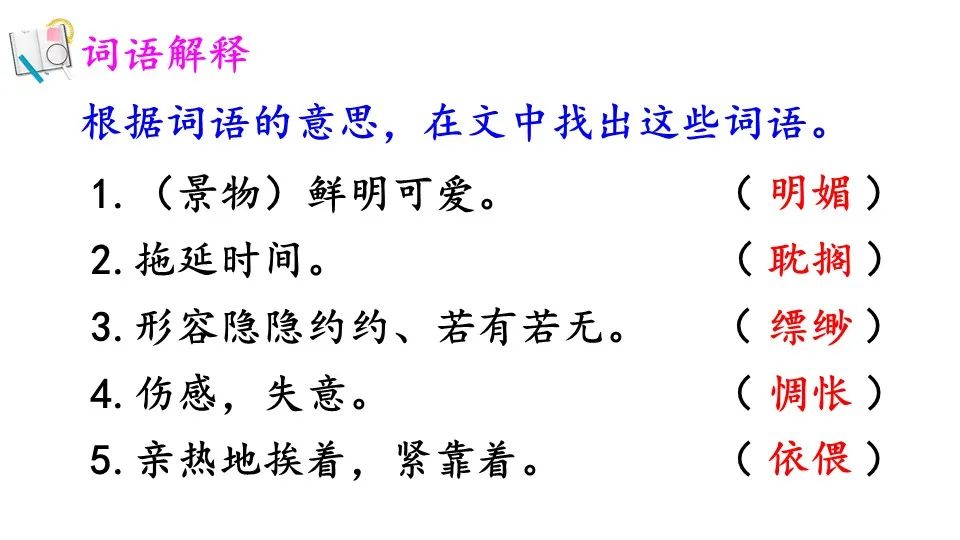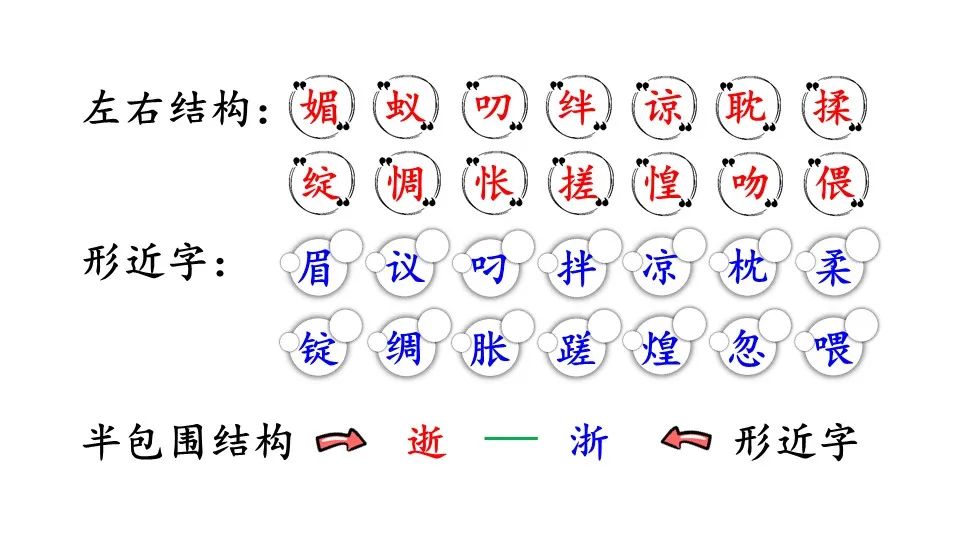 媚(明媚)蚁(蚂蚁)淀(淀粉)吻(吻合)偎(依偎)