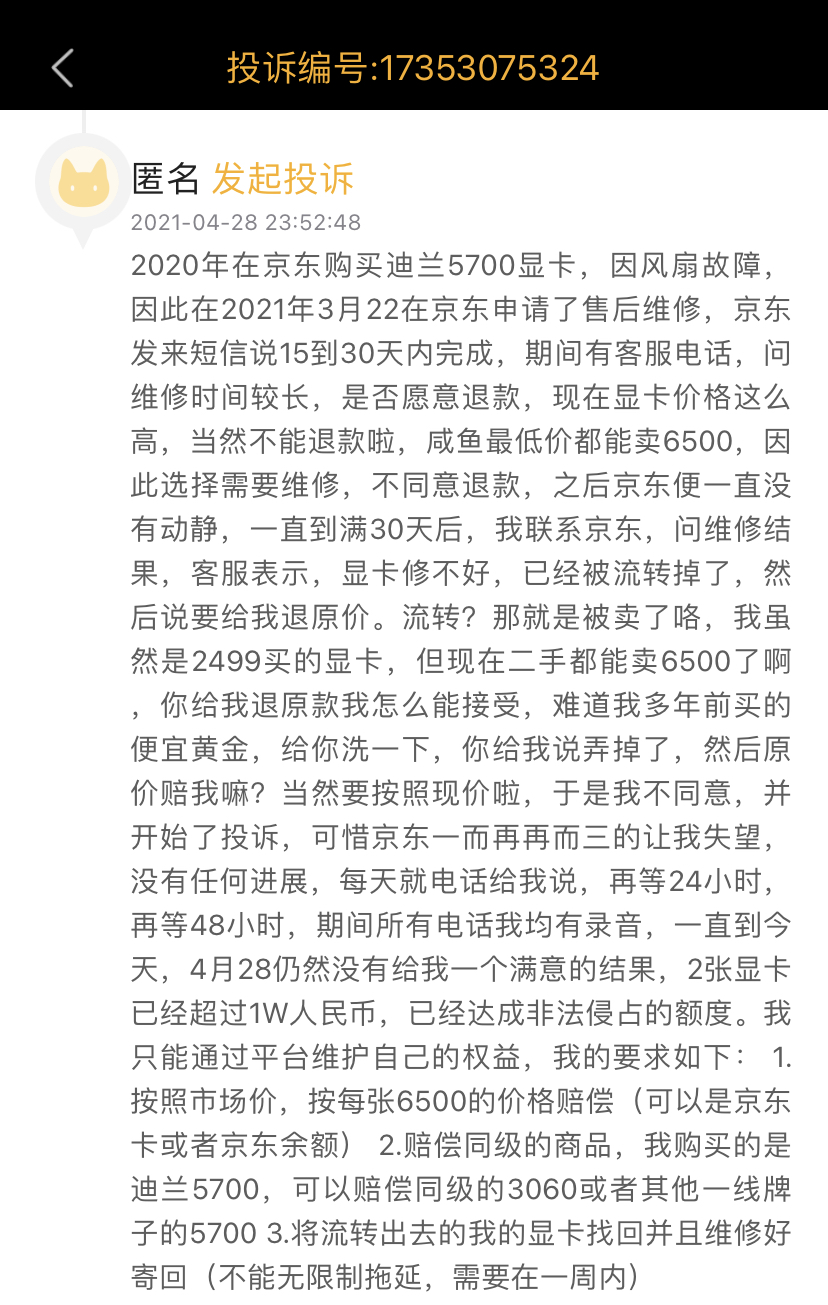对此,京东商城回应称:京东会妥善处理个别显卡售后的问题,目前包括显卡在内的商品售后维修都正常运行。