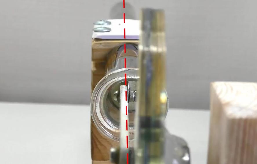 等胶干后,将飞轮上的轴承安装在木头支撑件铁管上,转动飞轮看其是否顺畅和歪斜。