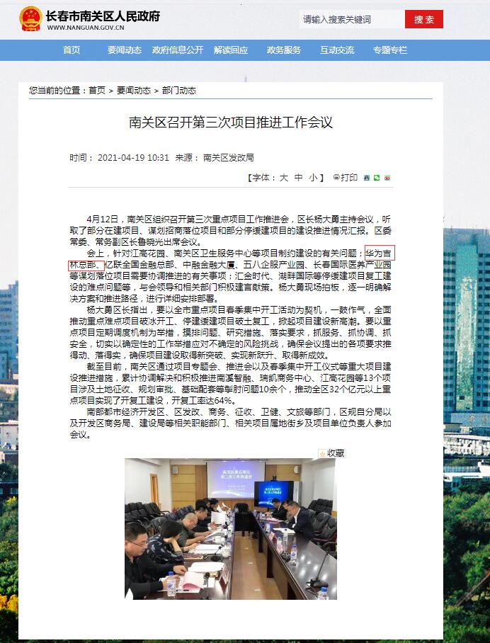 依据则来源于今年4月19日长春市南关区政府发布的一条名为《南关区召开第三次项目推进工作会议》消息。