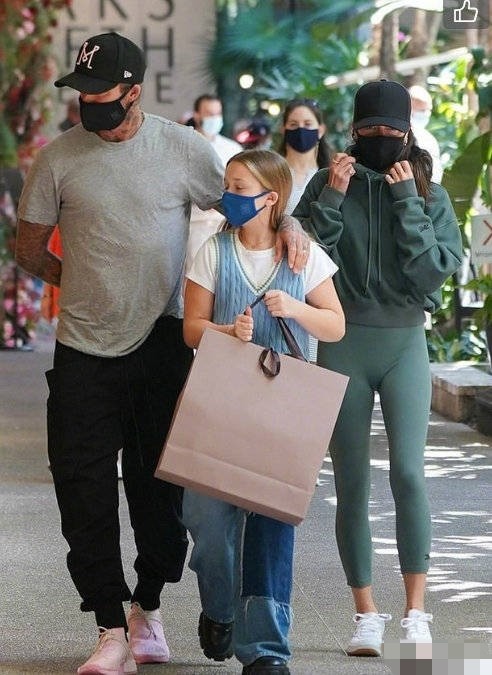 在一张近景照片中可以更清晰地看到贝克汉姆一家人都戴着口罩,维多利亚身穿一件款式宽松的上衣搭配一条紧身裤大秀s型火辣身材,而她9岁的女儿则手提购物袋一边走一边东张西望,从照片上来看她比从前长高了很多,身高直逼走在一边的妈妈。