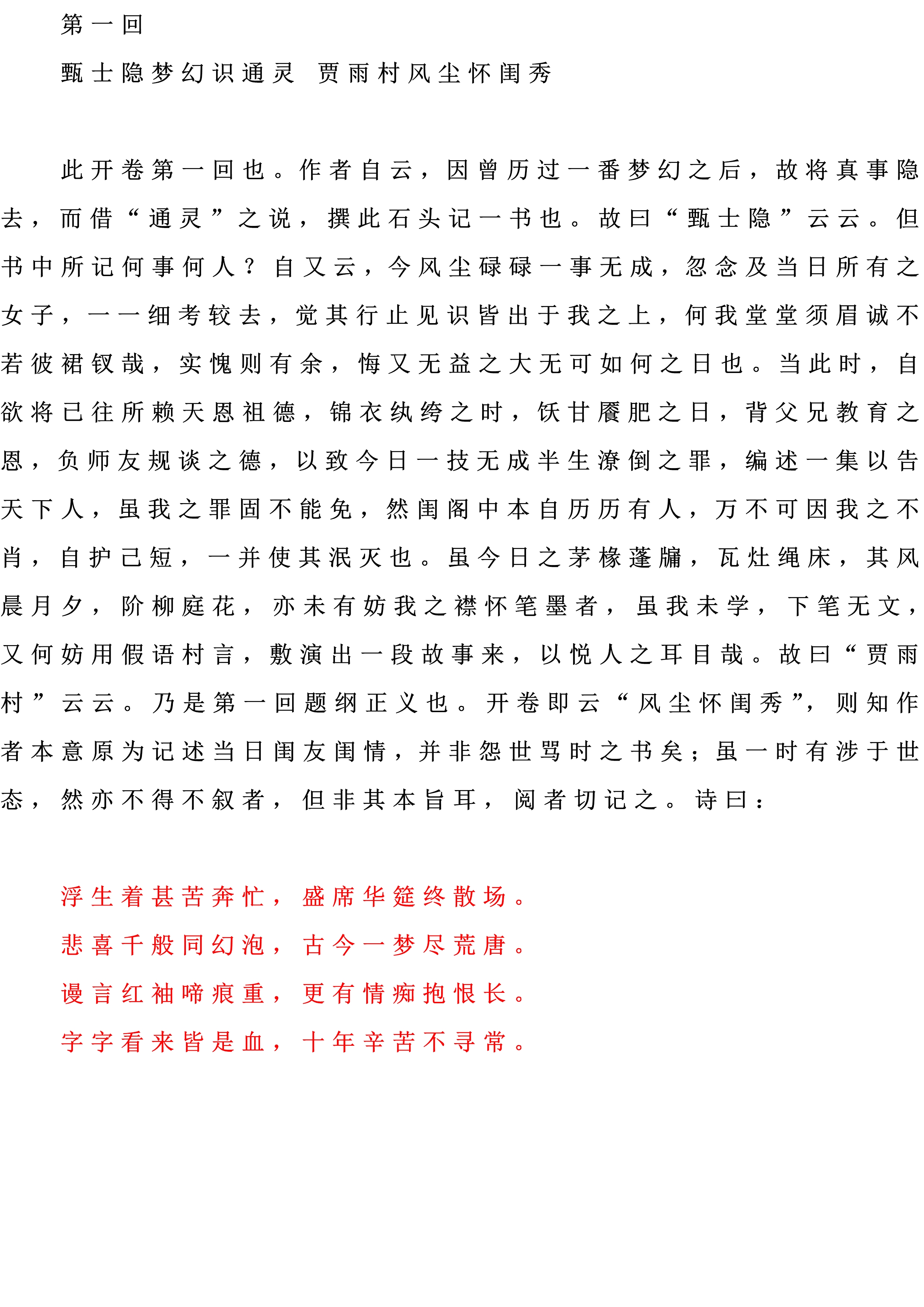【标题批注】“甄士隐梦幻识通灵”有两层含义,表层含义就是说甄士隐在梦中看见并认识了通灵宝玉,这也就是这第一回的一部分主要内容的高度概括,但同时这句话还具有深层含义,“甄士隐”谐音“真事隐”,暗示《红楼梦》中内容有来自真实的事情,但作者将这真事隐去了。“贾雨村风尘怀闺秀”同样有两层含义,表层含义就是说贾雨村在落魄之际有闺中女子爱上他,同样是第一回一部分内容的高度概括,这句话的深层含义同样要靠谐音来理解,“贾雨村”谐音“假语村”,意思是说《红楼梦》是用虚构的语言来写成的。这第一回开篇,就一真一假,真中有假,假中有真,形成对照,真可谓构思奇特。