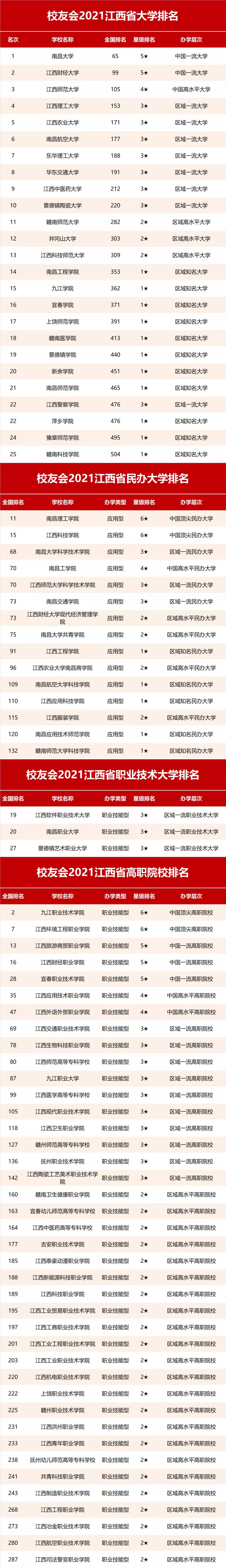 在校友会2021中国职业技术大学排名中,江西软件职业技术大学全国排名第19,雄居2021校友会江西省职业技术大学排名第一;南昌职业大学全国排名第20名,居第2;景德镇艺术职业大学全国排名第27名,居第3。