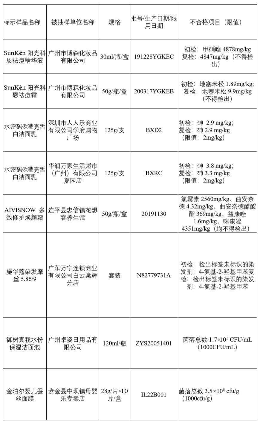 在广东省药品监督管理局发布的2020年第10期化妆品监督抽检结果中,不合格样品8批次,广东万宁连锁商业有限公司白裳辉分店的施华蔻染发摩丝5.86/9 套装初检被检出标签未标识的染发剂:4-氨基-2-羟基甲苯,复检同样又被检出标签未标识的染发剂:4-氨基-2-羟基甲苯。